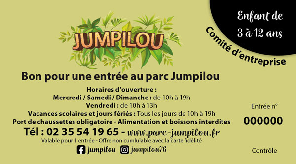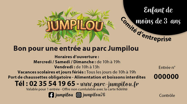 Pour chaque carnet acheté, Jumpilou vous offre 5 cartes crêpes, à utiliser au snack du parc. Un petit plus qui fait toujours plaisir aux enfants… et aux parents !